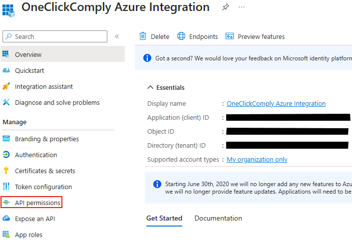 You will be redirected to the app registration page for your newly created application. Click on API permissions.