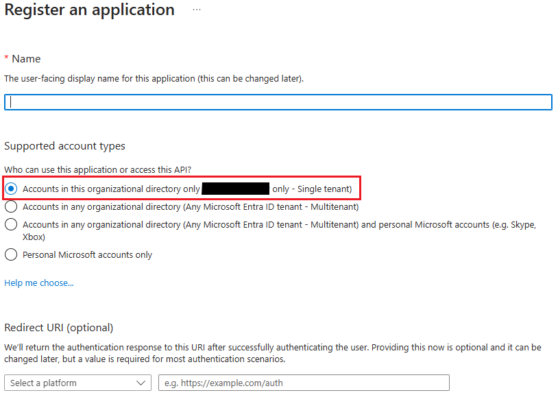 Ensure that the Supported account type selected is "Accounts in this organisational directory only (Single tenant)". Any other option will prevent the integration from completing successfully.