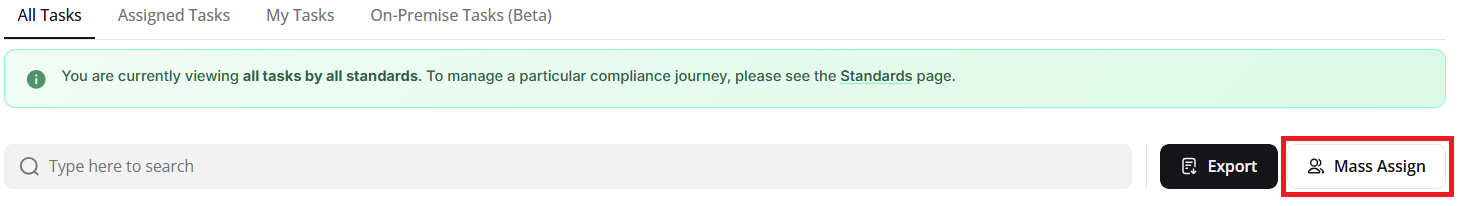 To access the Mass Assign feature, navigate to the All Tasks area of the platform, and select the Mass Assign option, as shown below: