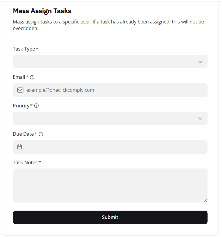 The OneClickComply platform also supports the ability to instantly assign multiple tasks of a set category to a user, known as Mass Assigning.