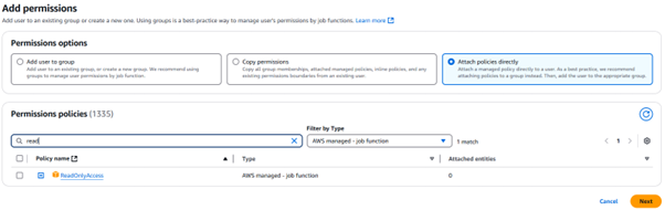 Type 'Read' into the search box and tick ReadOnlyAccess.