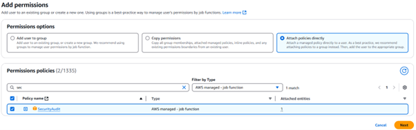 Once named, click the Next button to move to the Permissions page. (If you chose to use a pre-existing IAM user, go to the account, click the Permissions tab, then Add Permissions, and then Add Permissions again).
