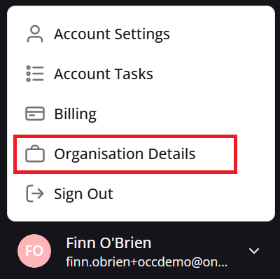 Your OneClickComply account will have one account owner, and as many administrators and auditor profiles as required. You can access the Account Users area by clicking your name in the bottom on the navigation bar, selecting Organisation Details from the dropdown, as shown below: