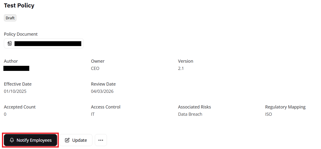 This will open a new window that provides more information about this policy, such as the regulatory mapping, associated risks, and the access control. There will also be a button labelled Notify Employees (see below), which will send an email to all the addresses that were specified during the creation of the policy.