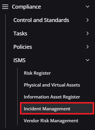 You can access this area by selecting the Incident Management button from within Compliance > ISMS, as shown below: