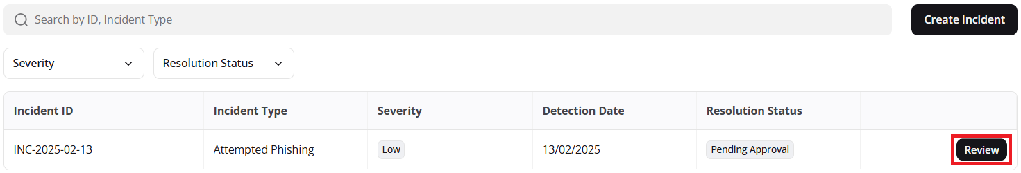 All incidents that occur within a business must be recorded accurately for compliance and improvement purposes. These incidents can be updated by selecting Review on the desired incident, as shown below: