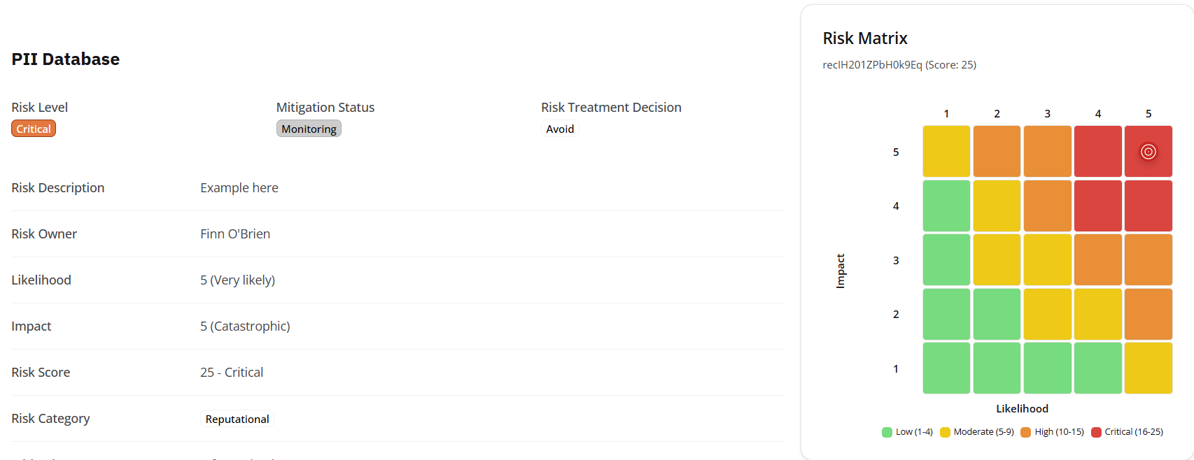 This page will also include a Risk Matrix, which will visually indicate the current risk level associated with this record. In the example provided below, this record is at the highest risk level (25 - Critical).