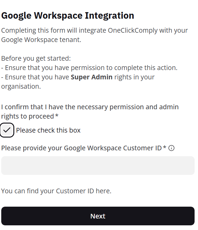 Check the confirmation box to reveal the Customer ID field. Enter your Google Workspace customer ID then click Next.