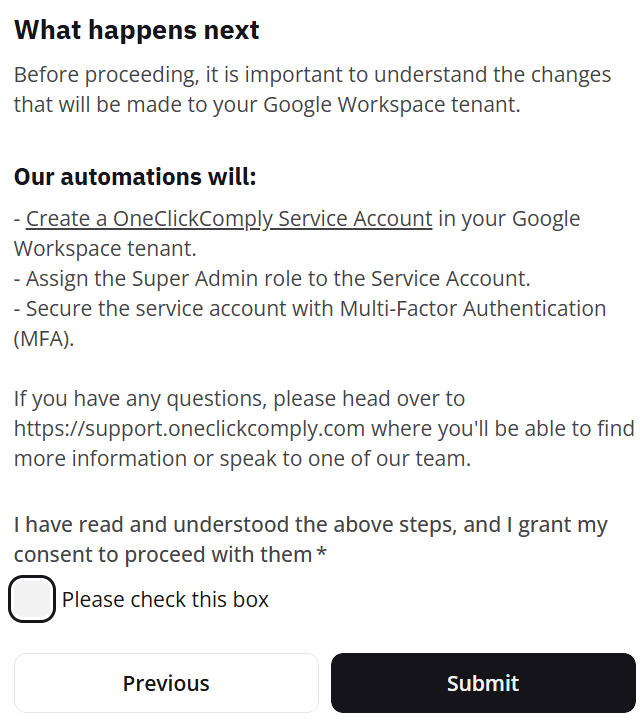 Carefully read the outlined changes that will be made to your Google Workspace tenant. Once reviewed, acknowledge the terms and click Submit.