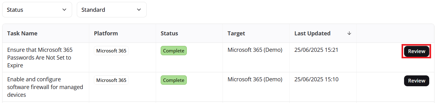 If you wish to examine a completed task in greater detail, select the Review option located to the right of each listed task, as indicated below.