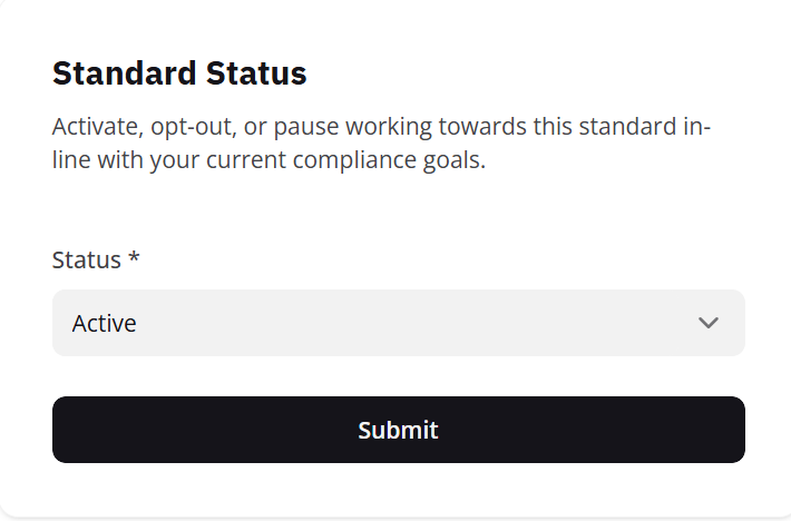 To change the status of a compliance standard, select the Edit Status button within the standard's box. This will open a side-window, allowing you to choose the status of the standard, as shown below: