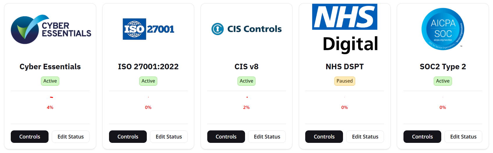 Active: The standard has been enabled with the platform, as the organisation is currently working towards achieving compliance with this standard. Once a standard is set to Active, the controls and tasks associated with a control will also be visible.