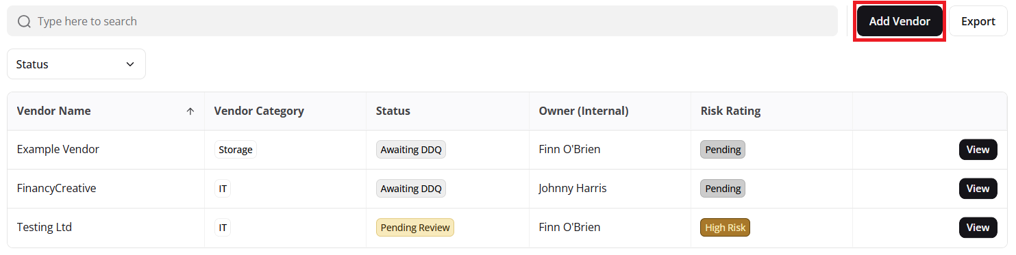 Once you have navigated to the Vendor Risk Management area, you will see a page similar to the following: