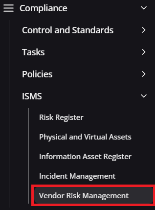 The Vendor Risk Management area of the OneClickComply platform allows you to log third-party vendors associated with your business, manage the risks associated with them, and automatically send and collect due diligence questionnaires. It can by accessed by selecting the Vendor Risk Management button from within Compliance > ISMS, as shown below: