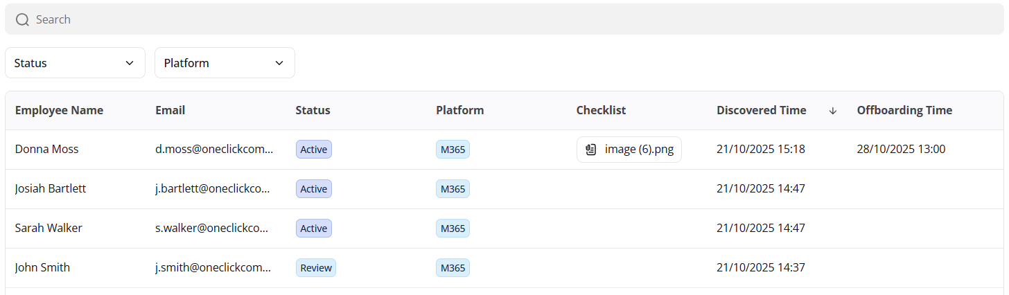 To retrieve this list, the OneClickComply platform performs an automated scan to identify all associated user accounts within Microsoft 365 and Google Workspace. This account data is then compared against records in the internal employee database.