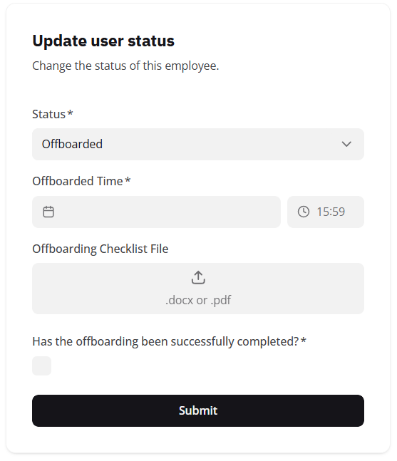 If the status of an employee is changed to Offboarded, additional fields will appear. These fields allow you to specify the date and time that they employee was offboarded, and to upload a offboarding checklist if one was followed or needs to be completed.