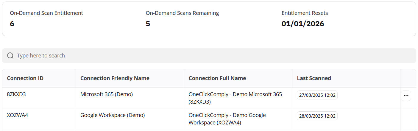 On this new page you will see a list of all connected environments, the number of scans you are entitled to, how many you have remaining, and when your entitlement will reset.