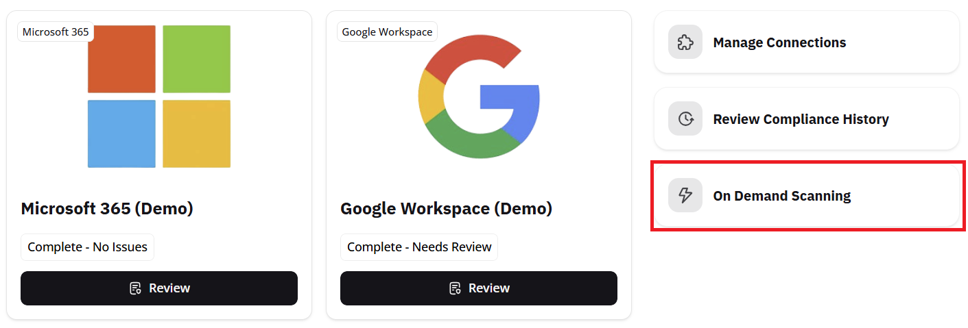 The On-Demand Scanning feature works in parallel to Continuous Monitoring, allowing you to carry out instant point-in-time scans for additional peace-of-mind.