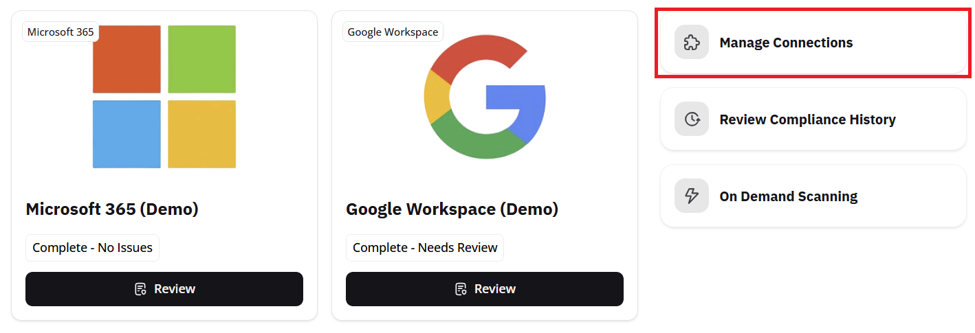 From the Continuous Monitoring dashboard, select Manage Connections to open the settings area.