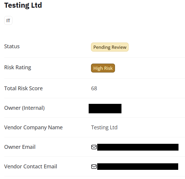 This new window will ask for name and email address of the vendor owner (the person taking responsibility) and then ask for information such as the vendor's credit score, reputational risk, geopolitical risk, and legal/contractual risk.
