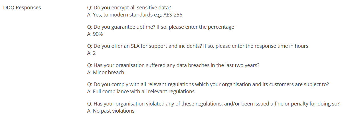 Screenshot showing example due diligence questionnaire answers