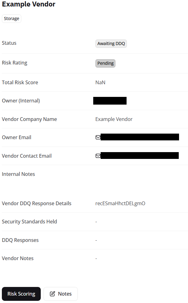 In this example, we have a added a third-party vendor imaginatively called 'Example Vendor'. This vendor has no assigned value for the Total Risk Score, and no answers for the Vendor DDQ (Due Diligence Questionnaire). Selecting Risk Scoring will open a new window.