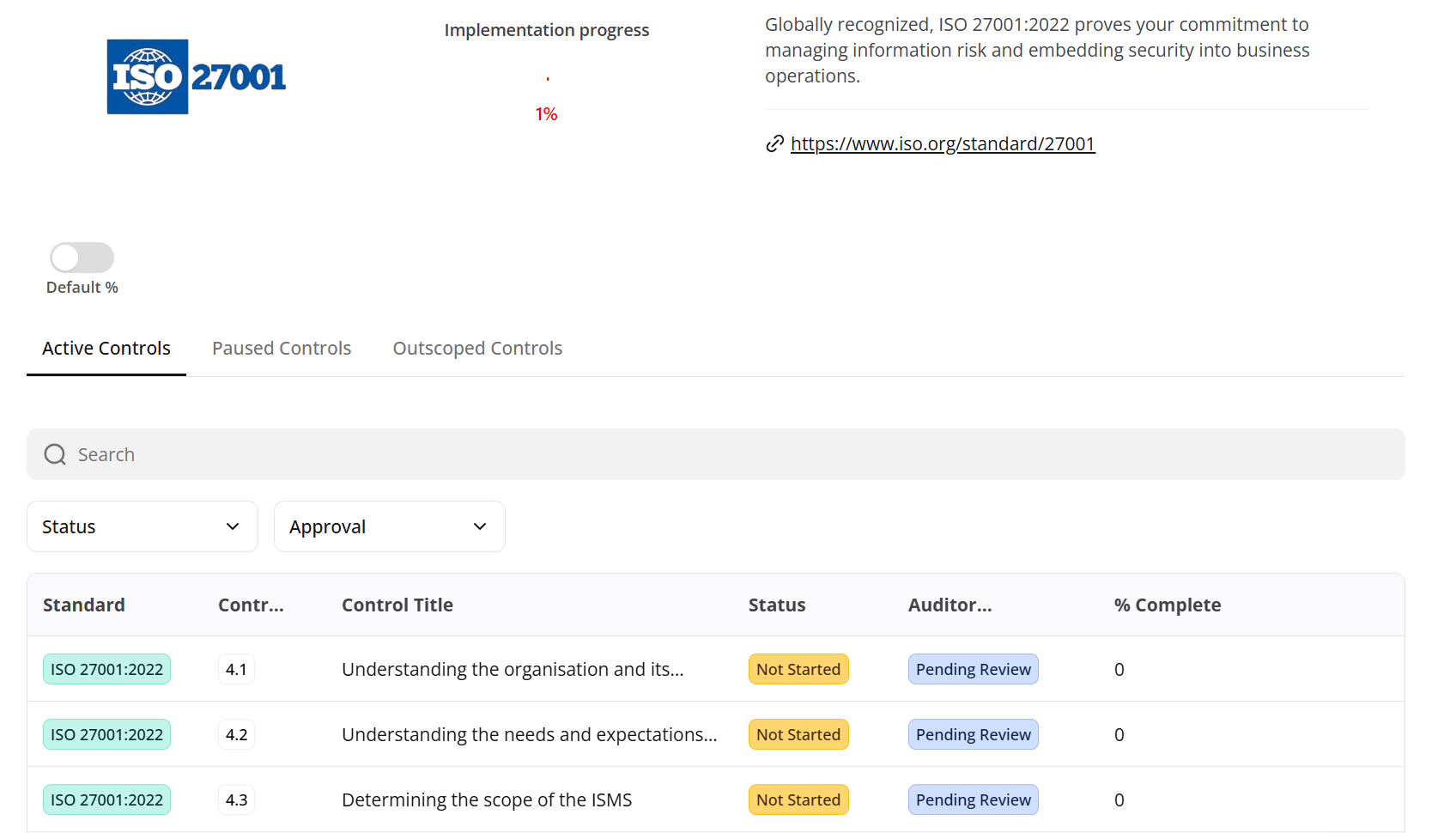 Let's have a look at the controls page for ISO 27001: